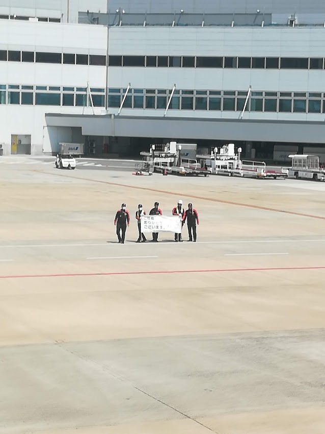 その中で、飛行場でこの横断幕?をかかげていた職員のみなさんの姿が忘れられません